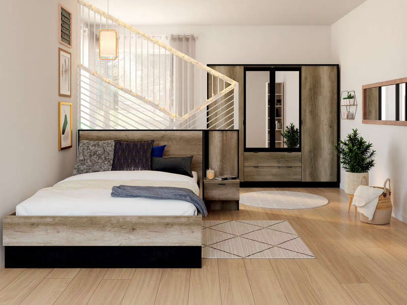 Ce lit TORONTO vous offre le mariage entre le décor chêne Authentique au toucher structuré, chaleureux et naturel et des touches anthracites rappelant les structures industrielles.